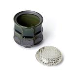 Incensiera dall'aspetto importante e dignitoso con un' ampia apertura. Coperchio d'argento (Hoya) spunta nel verde di Oribe.